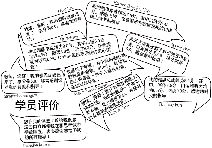 另外,正是EPiC Online的老师帮助了我了解了雅思考试,并且熟练了各种题型。每节雅思的专项练习课都是一次全真的模拟测试,还完全按照考试要求来进行训练。完成之后老师会针对错误进行讲解并给出相应解决措施。在写作口语的练习中老师甚至细心地会指出我所犯的每一个小小的语法错误,还会给出更加地道的说法。正是通过这样细微的改进我的英语水平不知不觉中上了一个台阶。我非常感谢EPiC Online提供给我一个这么好的学习平台,让我有机会接受诸位老师的悉心教导。"